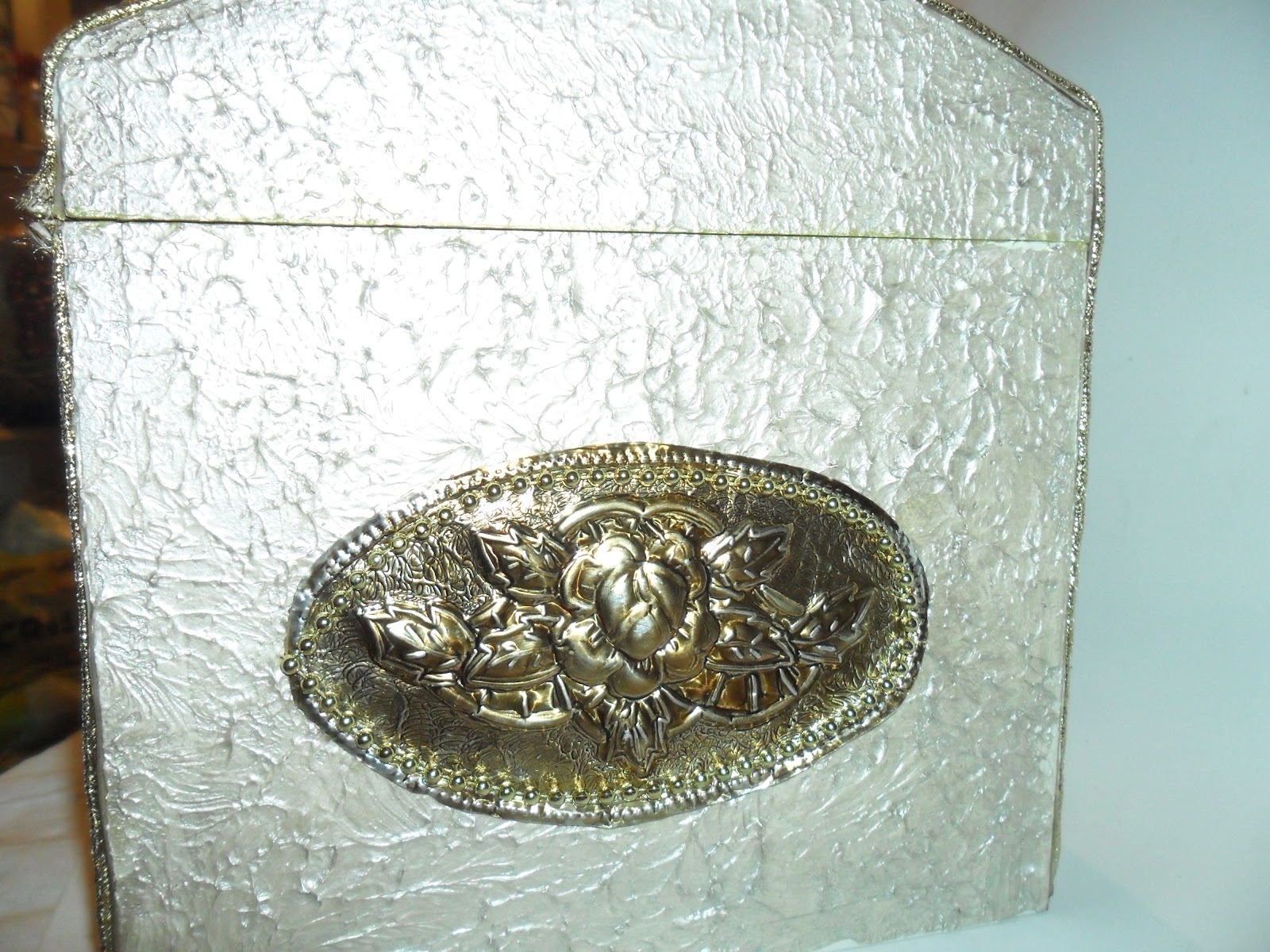 Baú em madeira, revestido com papel Kraft , pintado com tinta metálica dourada na parte externa. Com aplicação de latonagem vazada na tampa e na frente. A parte interna do baú foi pintada com a tinta metálica e no fundo apliquei pó de camurça.